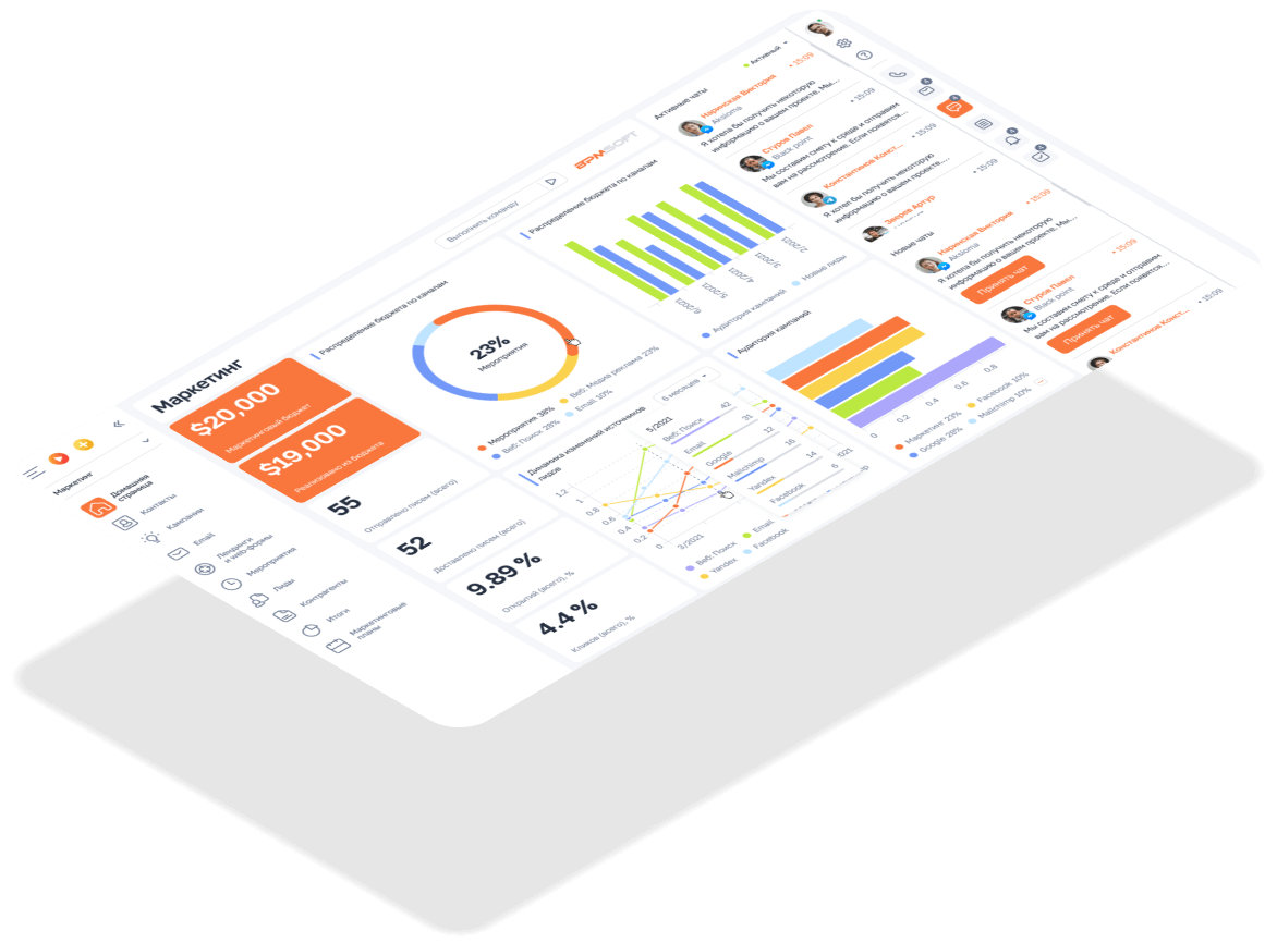 Подключение любых каналов коммуникаций с клиентами – звонки, массовые и персонифицированные рассылки, SMS-уведомления, сообщения в мессенджерах и социальных сетях, push-уведомления в мобильных приложениях, сообщения в личном кабинете клиента и пр.